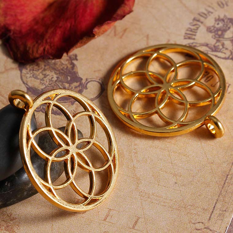 メタルチャーム シード・オブ・ライフ 選べる2色(金メッキ シルバートーン) 約35×30mm(2個入)/ ペンダントトップ シードオブライフ SeedOfLife 生命の種子 神聖幾何学 シンボル ハンドメイド材料 透かし 空枠 ゴールドカラー 銀色 バッグチャーム【ゆうパケット対応】