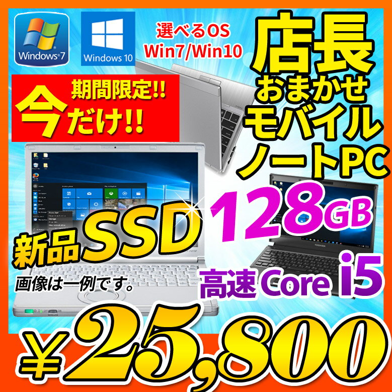 中古 モバイル ノートパソコン 今だけ!新品SSD搭載 WPS Office付き 店長おまかせ Windows10 Windows7 Core i5 WiFi メモリ 4GB 新品SSD 128GB 無線LAN メーカー問わず 東芝/富士通/Panasonic/Lenovo/DELL/HP等 オフィスソフト セキュリティソフト付 ノートPC