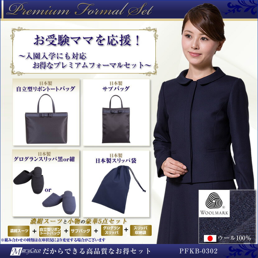 お受験ママを応援!日本製ウール100%濃紺スーツプレミアムフォーマルセット/濃紺ウールアンサンブルスーツ[濃紺アンサンブル+日本製トートバッグ+日本製サブバッグヒールスリッパ+スリッパ収納袋の豪華5点セット[お受験,紺,面接]PFKB-0302ラッキーシール対応】
