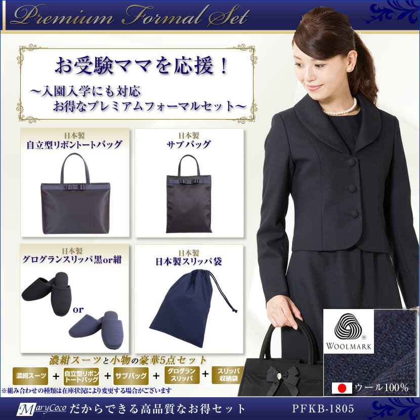 お受験ママを応援!日本製ウール100%濃紺スーツプレミアムフォーマルセット/濃紺ウールアンサンブル(半袖)[濃紺アンサンブル+日本製トートバッグ+日本製サブバッグ+ヒールスリッパ+スリッパ収納袋の豪華5点セット[お受験,紺,面接]PFKB-1802【ラッキーシール対応】